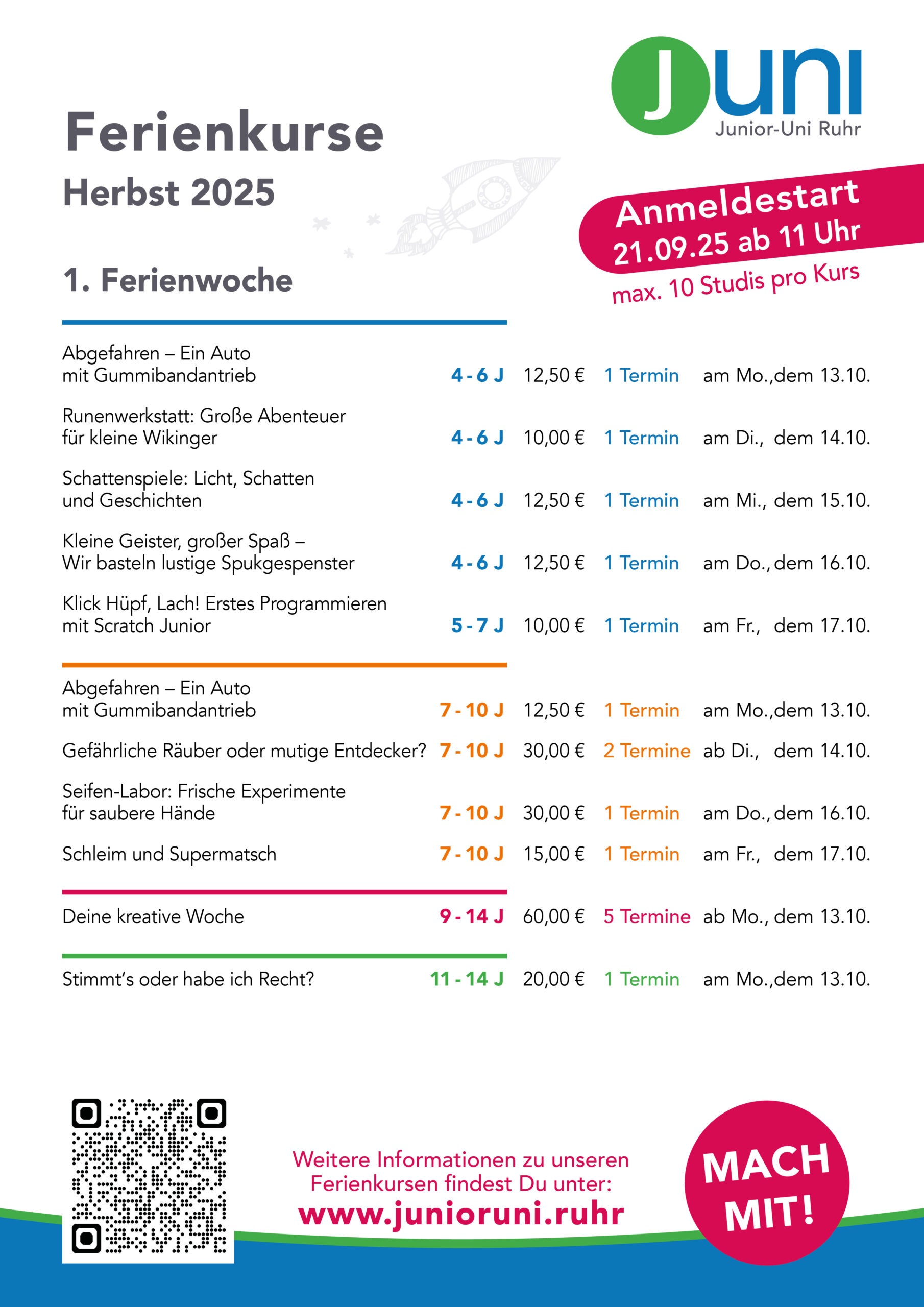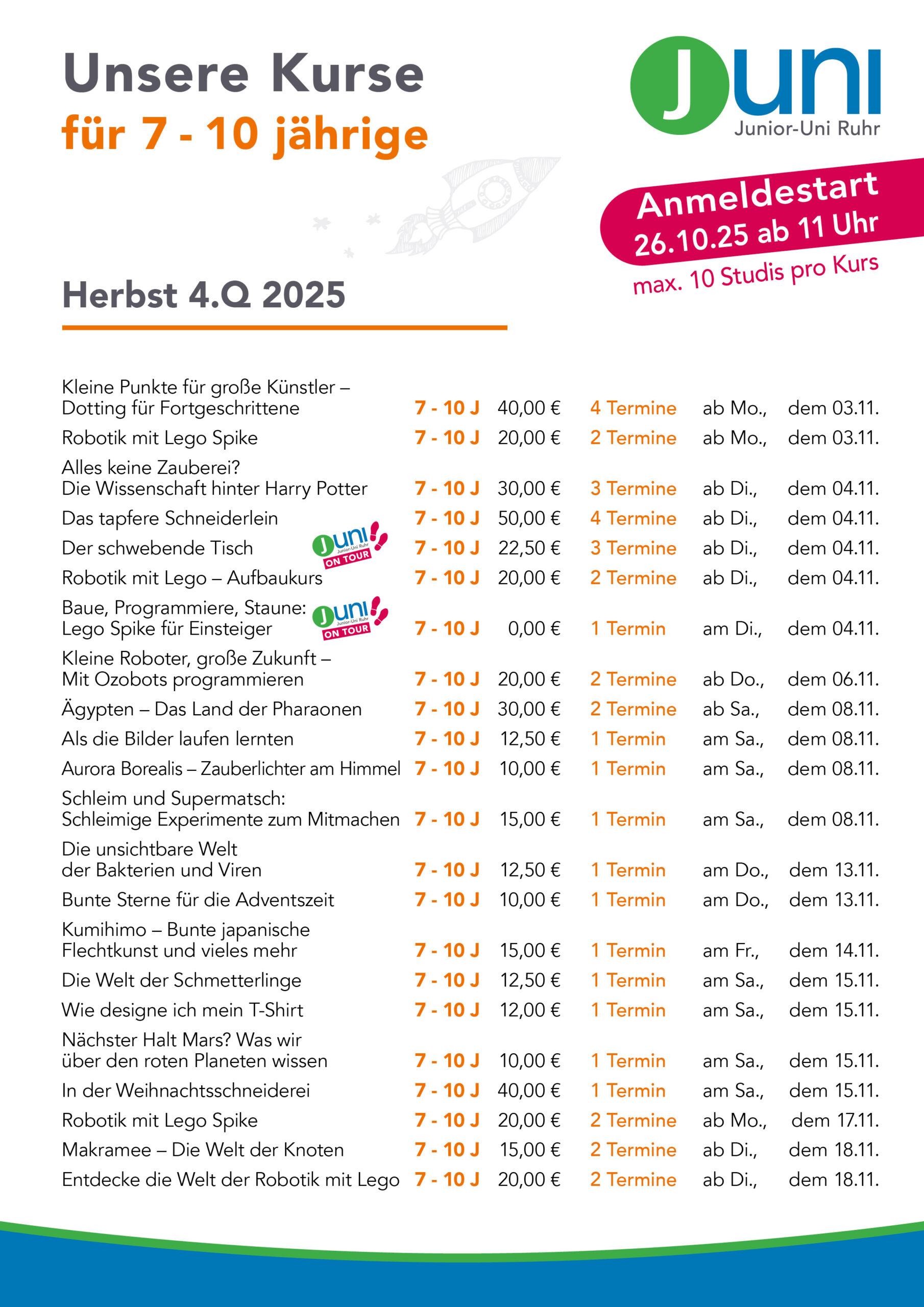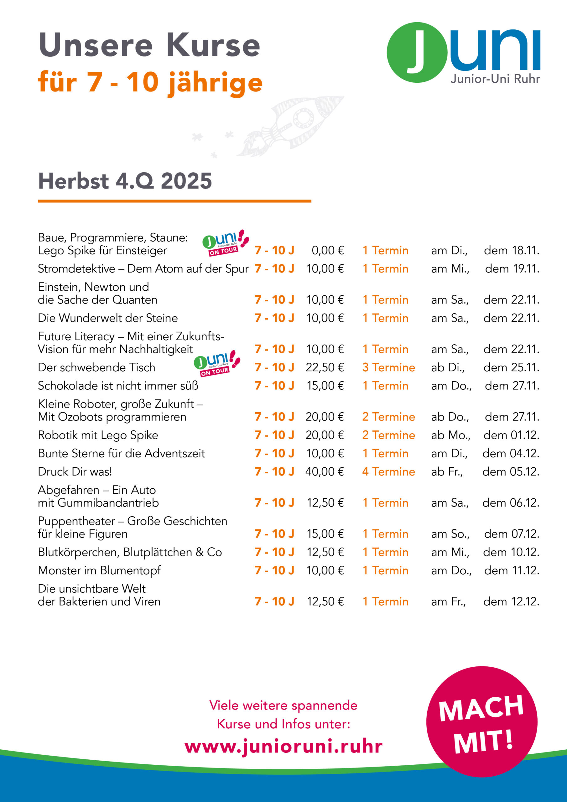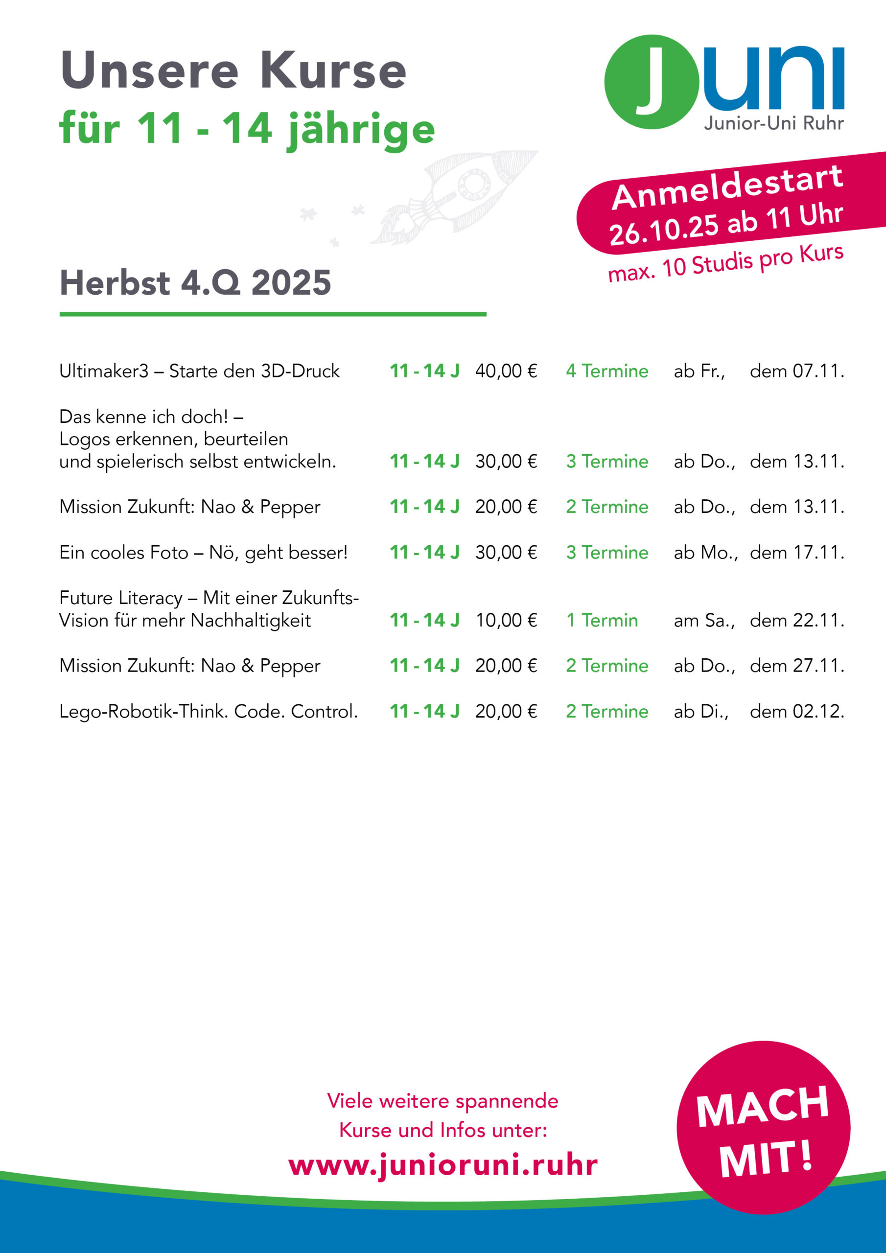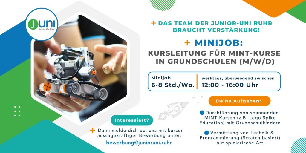 Die Junior-Uni Ruhr ist eine außerschulische, privat finanzierte und gemeinnützige Bildungs- und Forschungseinrichtung für Kinder und Jugendliche im Alter von 4 bis 17 Jahren. Die Zukunftsplattform in Mülheim ist ein Lern- und Erfahrungsort für außerschulische Bildung und nachhaltige Entwicklung. Sie wurde 2019 in Mülheim an der Ruhr gegründet und verfolgt das Ziel, jungen Menschen in Mülheim und Umgebung Raum für Neugier, Entdeckerfreude und Forscherdrang zu bieten. Die praxisorientierten Kurse der Junior-Uni Ruhr geben Kindern und Jugendlichen bis zum Eintritt ins Berufsleben Raum für ihre Neugier, Entdeckerfreude und ihren Forscherdrang – und das ganz ohne Noten oder Leistungsdruck. Hier treffen sich Blitzbirnen, Tüftlerinnen, Vielfrager und Experimentierfans, um in fünf wissenschaftlichen Themenfeldern Zukunft auszuprobieren.